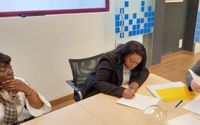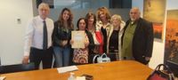 Firma de la cancelación de deuda de nuestra compañera María del Mar, acompañada por Don Valentín Hernández Saro, Ángel Valentín Campos Pavón, Valentyna Putnyk, Angelines Magro y la parte compradora